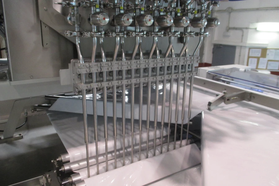 Obszar formowania obejmuje stację ciągłego zgrzewania, umożliwiającą produkcję dłuższych saszetek z większymi ilościami produktu wewnątrz.